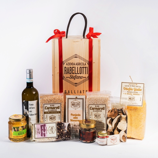 Cassetta abete cm 35x20x15,5 con miele 500g, bottiglia vino bianco Colline Novaresi vitigno Erbaluce 75cl, riso Carnaroli Classico Semilavorato 1000g, 2 preparato per risotto, nocciole 100g caramellate/cannella/caffè, riso Carnaroli Classico 1000g, funghi porcini secchi 50g, farina mais per plonta 750g