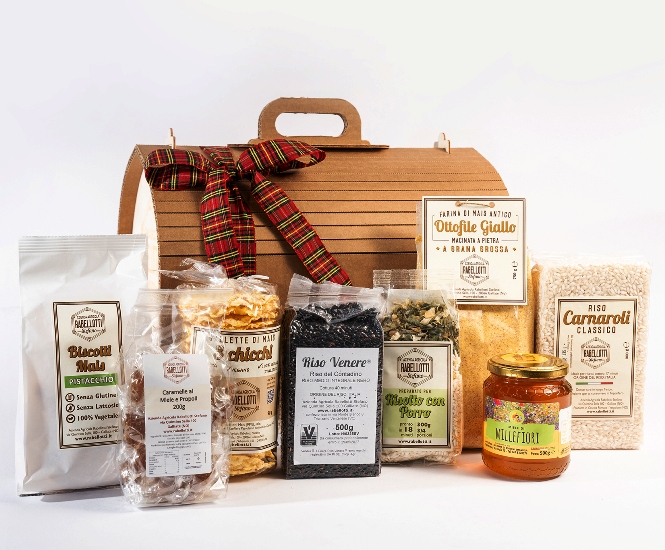 Bauletto 38x26x28cm con biscotti 200g, caramelle al miele 200g, gallette, riso rosso/nero integrale 500g, preparato per risotto 300g, farina di mais per polenta 750g, miele 500g, riso Carnaroli Classico 1000g
