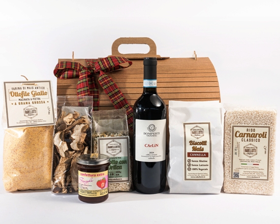 Bauletto 38x26x28cm con farina di mais per polenta 750g, funghi porcini secchi 50g, confettura 220g, preparato per risotto 300g, bottiglia vino Colline Novaresi DOC Nebbiolo 75cl, biscotti 200g, riso Carnaroli Classico 1000g