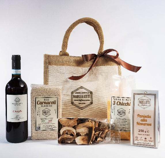 borsa juta 30x30x19cm con bottiglia vino Colline Novaresi DOC Nebbiolo 75cl, riso Carnaroli Classico 1000g, funghi porcini secchi 50g, farina di mais per polenta 750g, preparato per paniscia novarese.