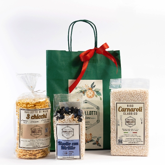 Borsa carta cm 22×29 con gallette, preparato per risotto, riso Carnaroli Classico 1000g