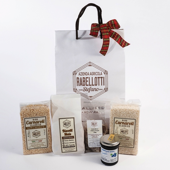 Shopper carta con riso Carnaroli Classico 1000g, riso Carnaroli Classico Semilavorato 1000g, biscotti 250g, caramelle al miele 200g, confettura 220g
