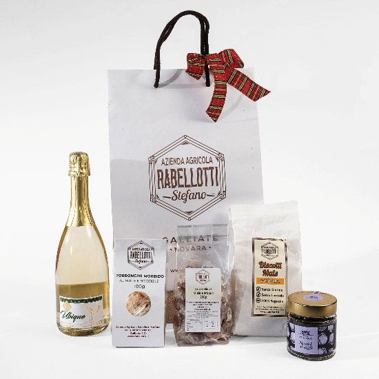 Shopper carta con bottiglia vino Spumante Riesling Extra Dry Oltrepò  Pavese 75cl, torroncini morbidi 100g, caramelle al miele 200g, biscotti 250g, nocciole 100g caramellate/cannella/caffè